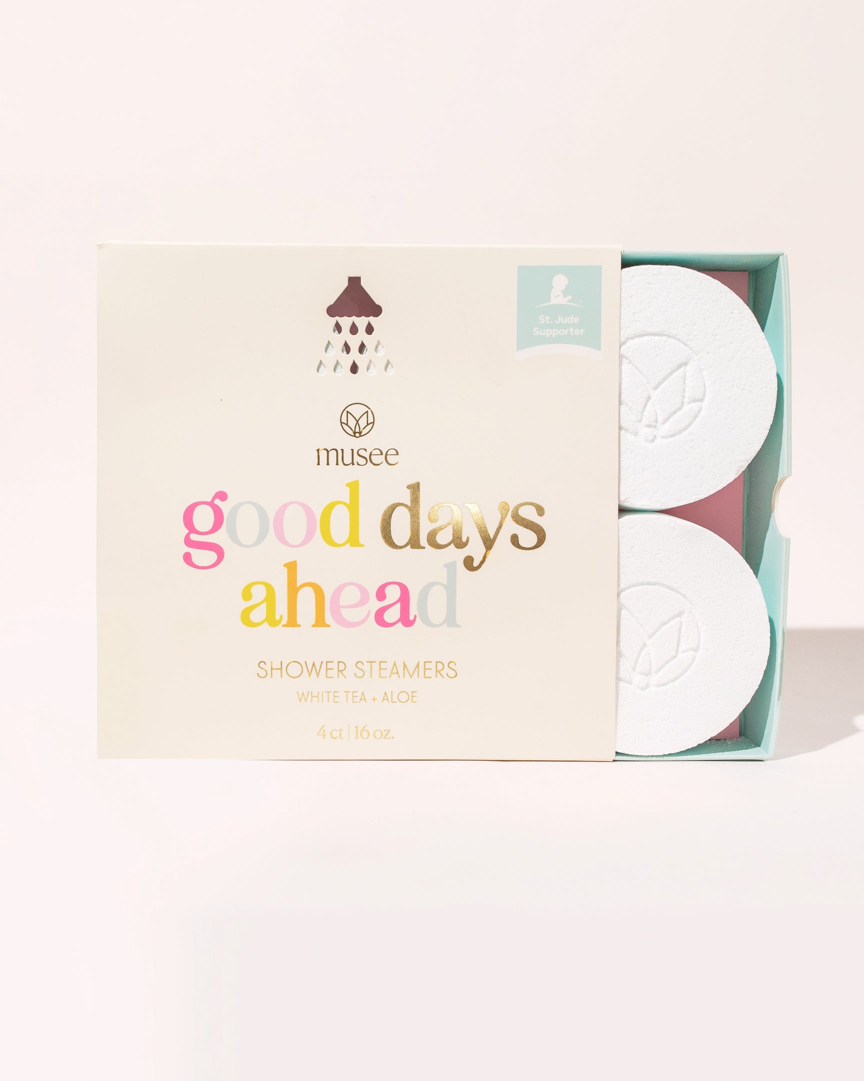 Musee X St. Jude Children's Research Hospital Shower Steamer Set of 4 | Refreshing scents of white tea and aloe. A portion of the profits from this set will go towards supporting St. Jude's groundbreaking research and treatment of childhood cancer and other life-treating diseases.