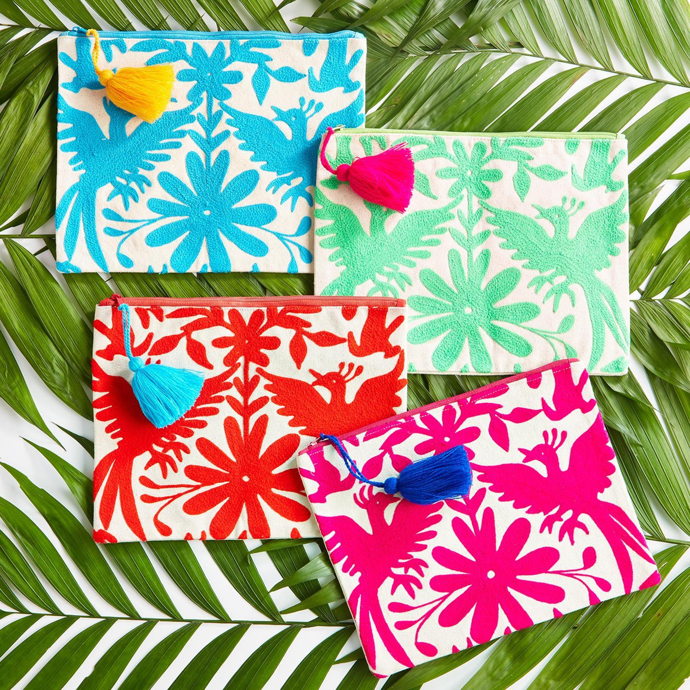 Hand-made vibrantly colored pouches with canvas back with decorative tassel