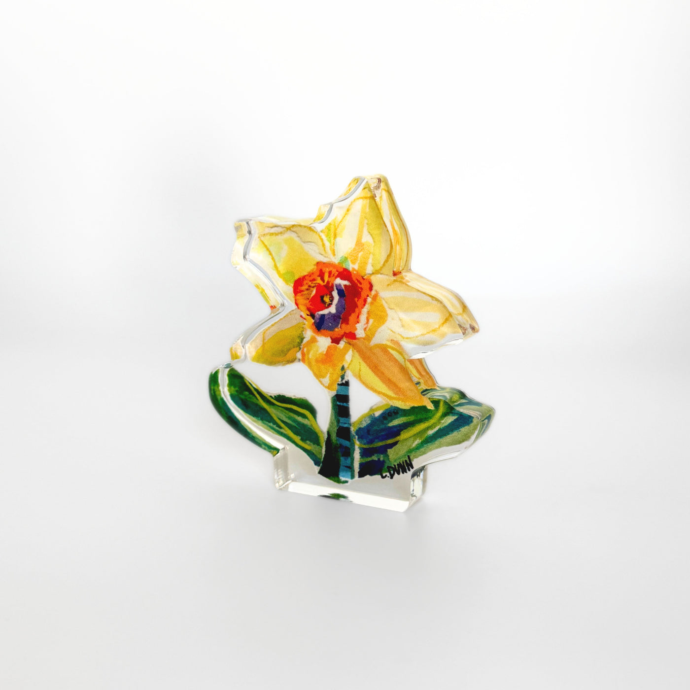 Single Daffodil Bloom features one of Lauren Dunn’s handmade paper collage designs, created with layers of hand-painted papers. This piece captures the cheerful character of a spring daffodil — bright, uplifting, and full of simple charm. The artwork is reproduced on polished acrylic, giving the piece a clean, modern profile while maintaining the character of the original collage.
